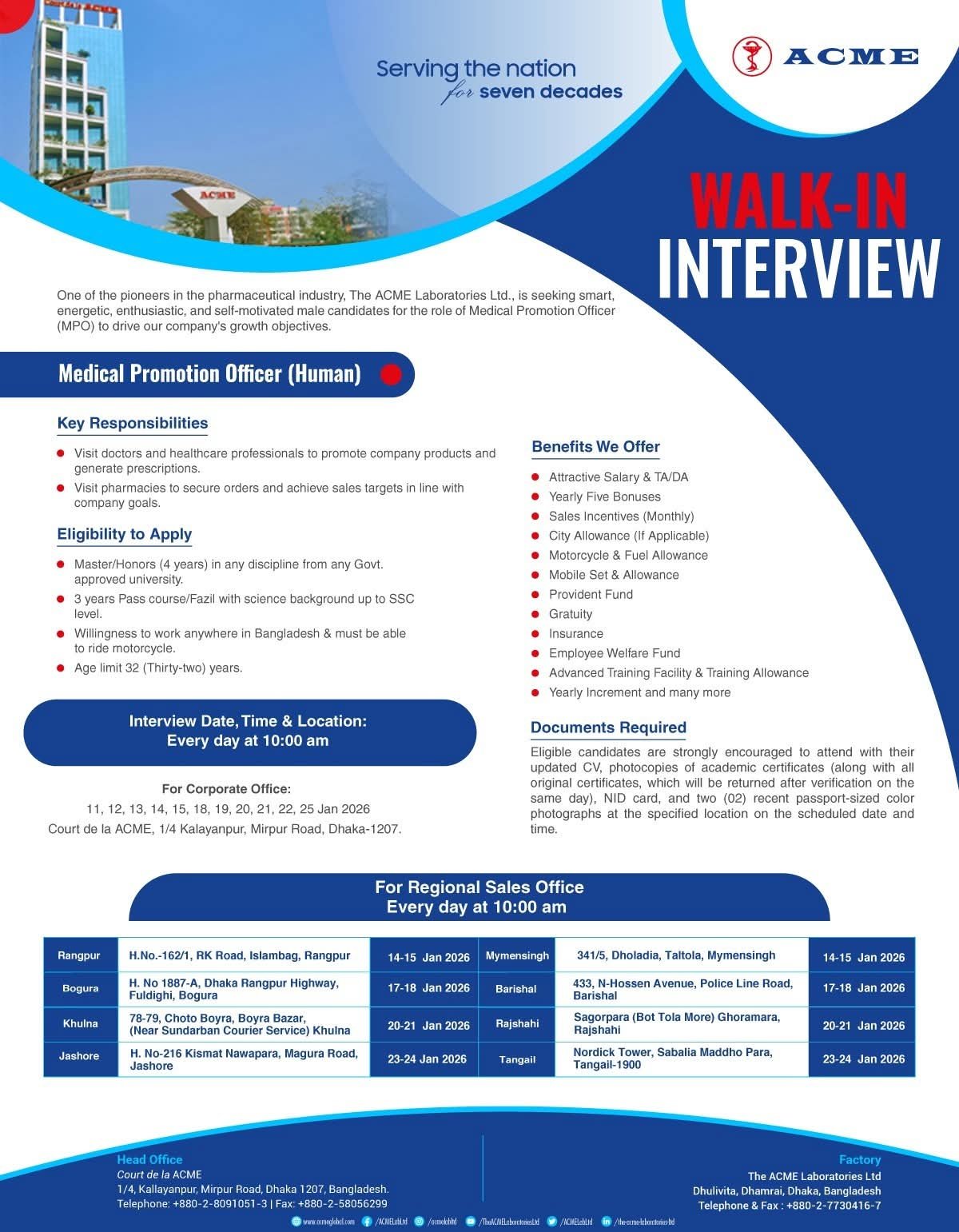Eligible candidates are strongly encouraged to attend with their updated CV, photocopies of academic certificates (along with all. original certificates, which will be returned after verification on the same day), NID card, and two (02) recent passport-sized color photographs at the specified location on the scheduled date and time. ACME Job Circular 2026 (ACME Laboratories Ltd)