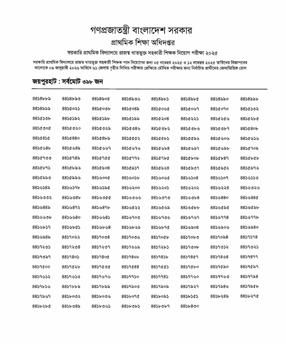 Assistant Teacher Recruitment Exam Result Joypurhat District