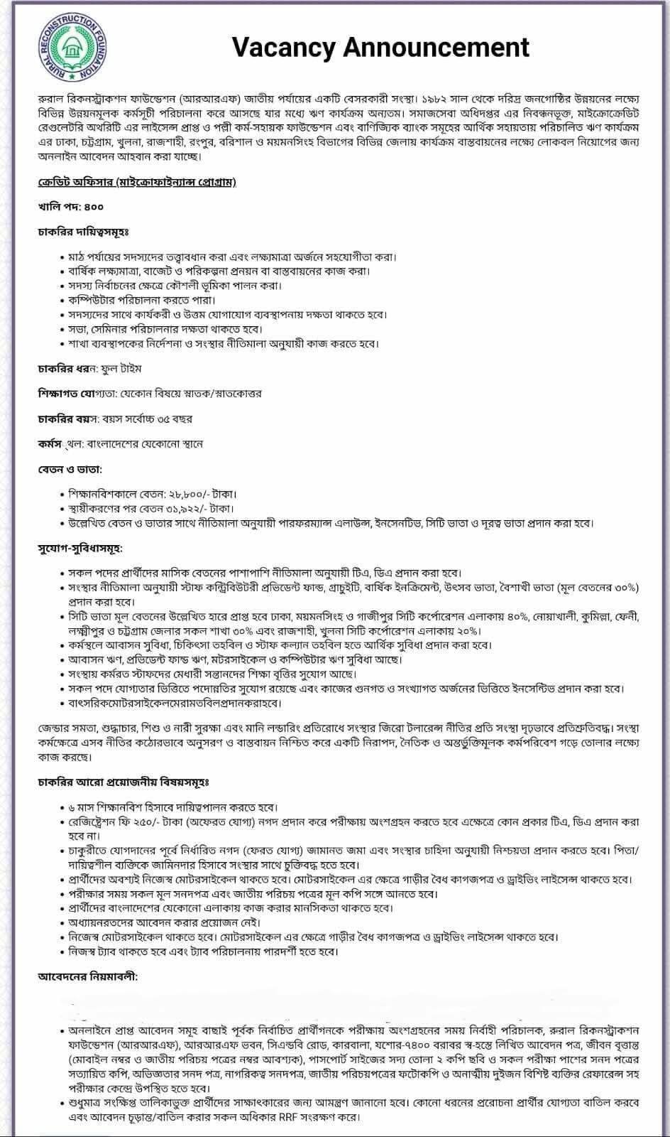 Rural Reconstruction Foundation (RRF) is a national level non-governmental organization. Since 1982, it has been conducting various developmental programs for the development of the poor, one of which is loan activities. Registered with the Department of Social Services, licensed by the Microcredit Regulatory Authority and operated with the financial support of the Rural Karma-Sahayak Foundation and commercial banks, the loan activities are being invited online for the recruitment of manpower to implement its activities in various districts of Dhaka, Chittagong, Khulna, Rajshahi, Rangpur, Barisal and Mymensingh divisions.