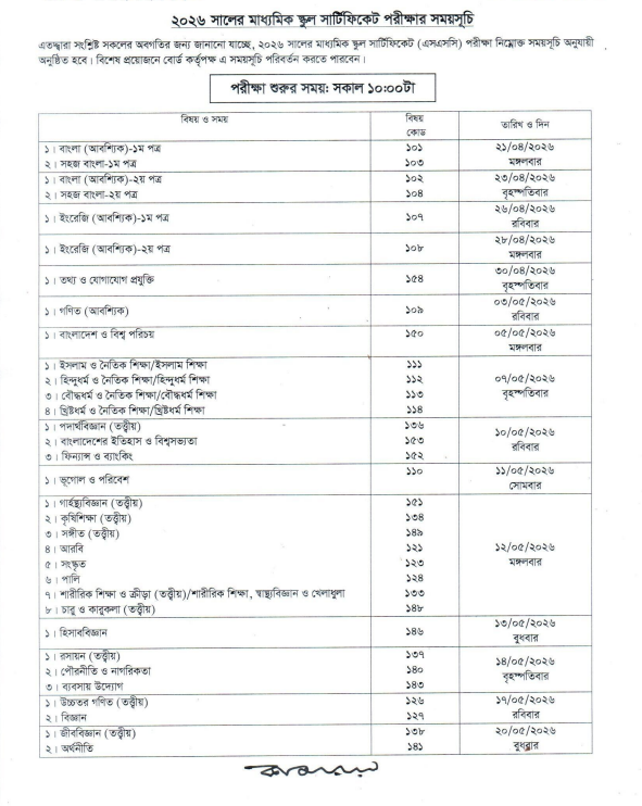 For the information of all, it is hereby informed that the 2026 Secondary School Certificate (SSC) examination will be held as per the following schedule. The board authorities may change this schedule in case of special need.